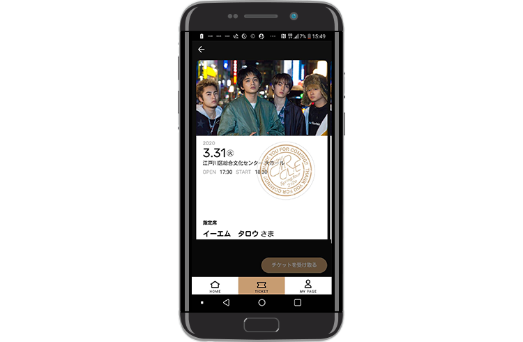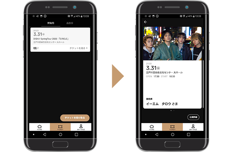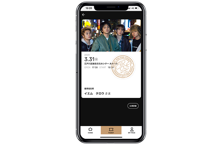 入場時はメニュー「チケット」→該当公演をタップした後に表示される「入場チェック画面」を入場スタッフにご提示ください。