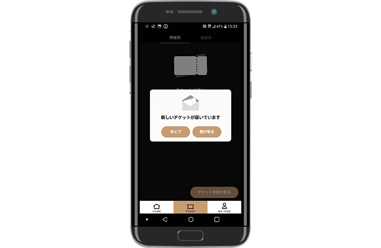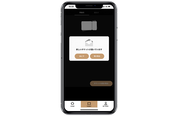 電子チケットの券面表示通知メールが届いた方は「新しいチケットが届いています」のメッセージをタップし、該当公演のチケットが表示されていることをご確認ください。