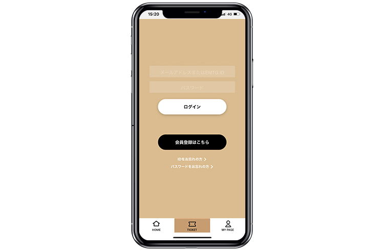 アプリを起動後、画面下部メニュー「チケット」をタップし、チケット応募時のPlus member ID(旧EMTG ID)(メールアドレスも可)とパスワードにてログインいただくと、チケットメニューがご利用いただけます。