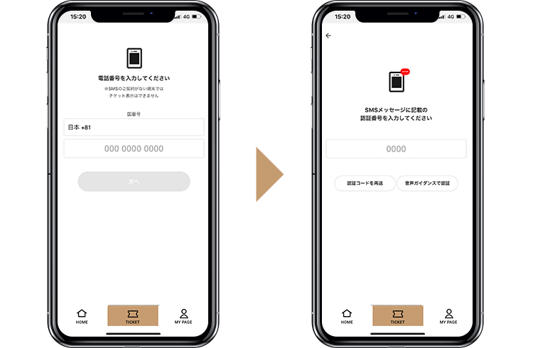 ※SMS契約が無く電話番号が無いスマートフォンでは、チケットメニューを利用することはできません。